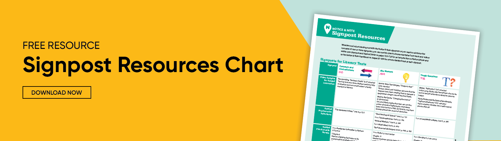 Resource for teachers: The HMH Into Reading Program Guide provides a table that shows where the Notice & Note signposts appear with texts. The Teacher’s Guide for each module includes a lesson on a targeted signpost.