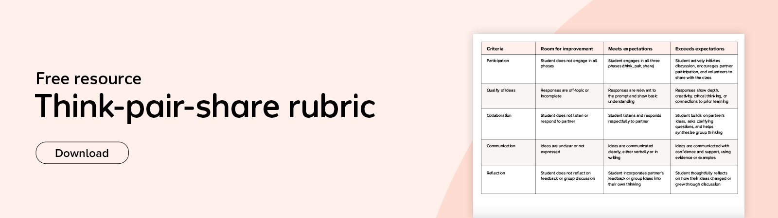 Rubrics can also support as a type of formative assessment by helping teachers quickly identify student understanding and areas for growth. But Lambert advises that think-pair-share should not add pressure or become a high-stakes assessment. "If you are going to assign a grade to it, make it that participation grade. You don't want something where you expect your students to comfortably share to become more stressful."